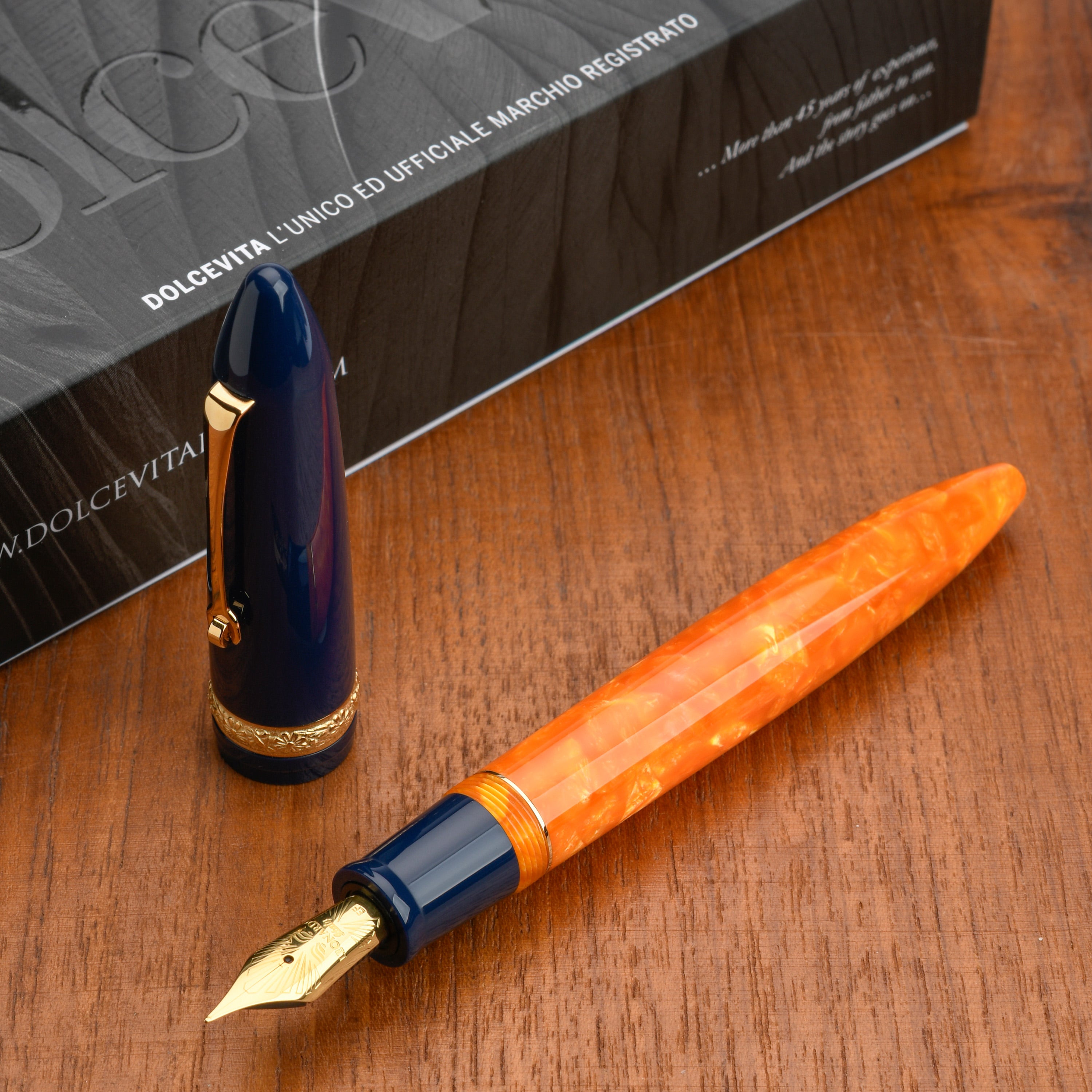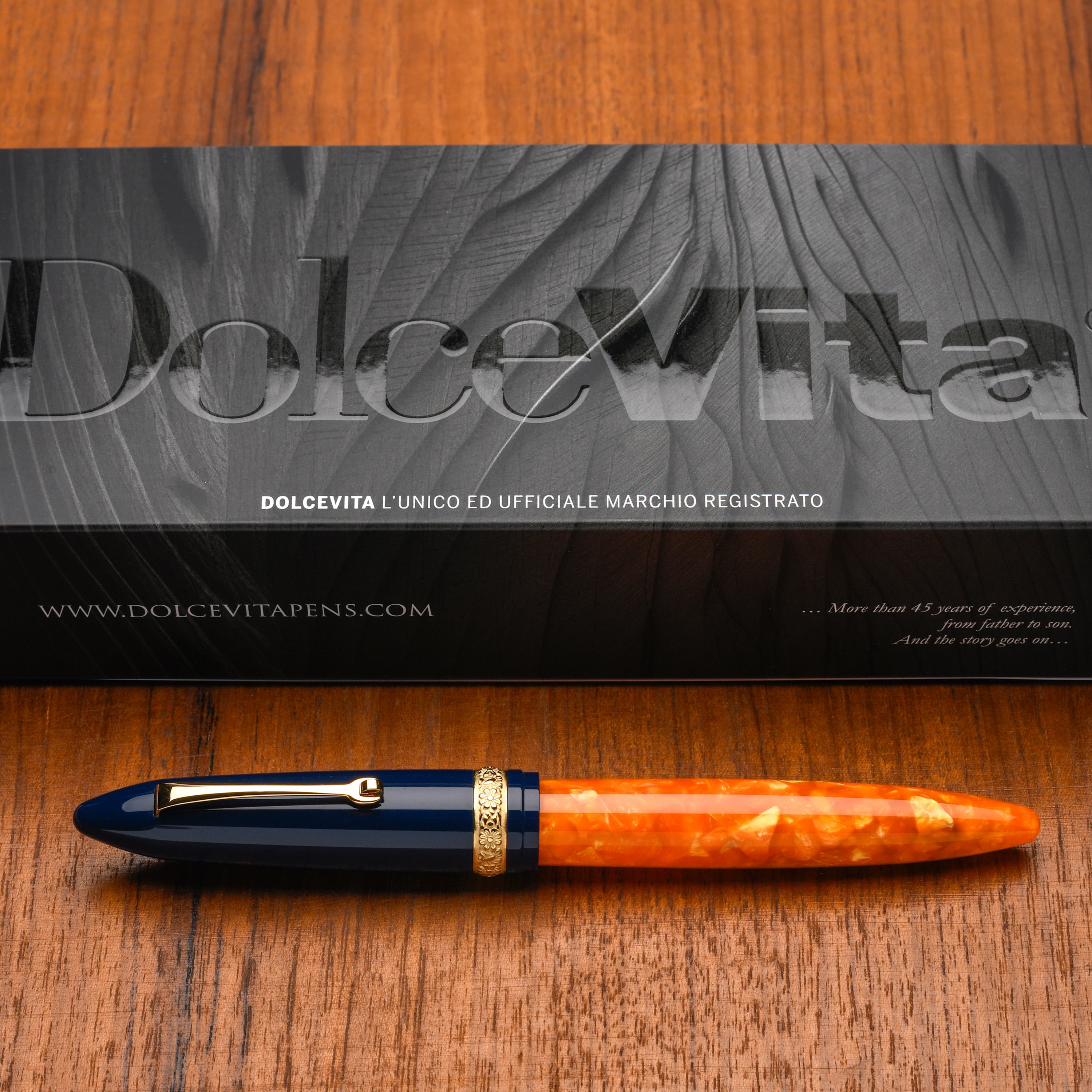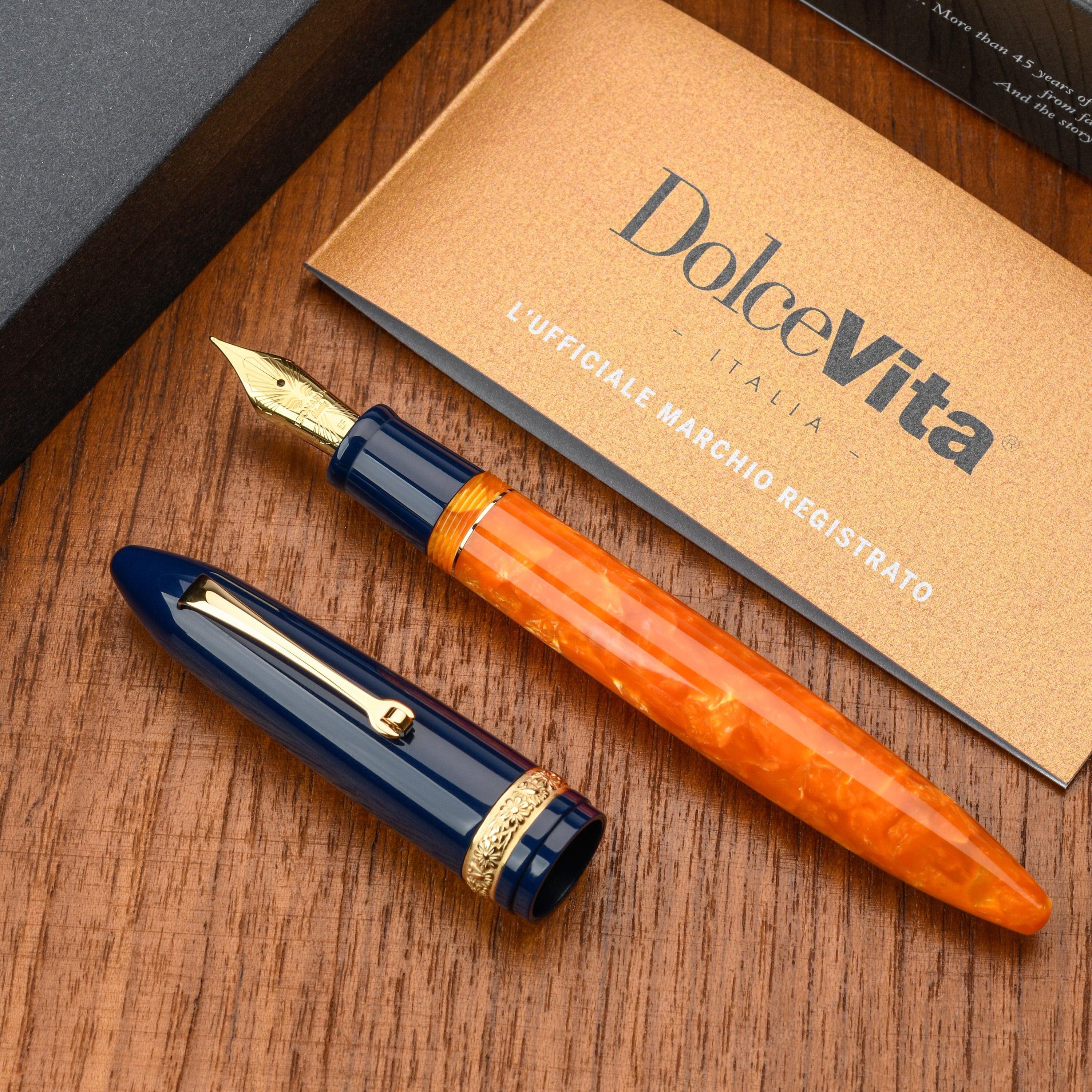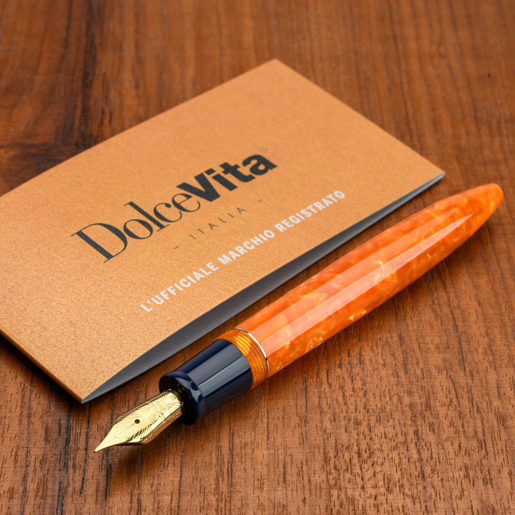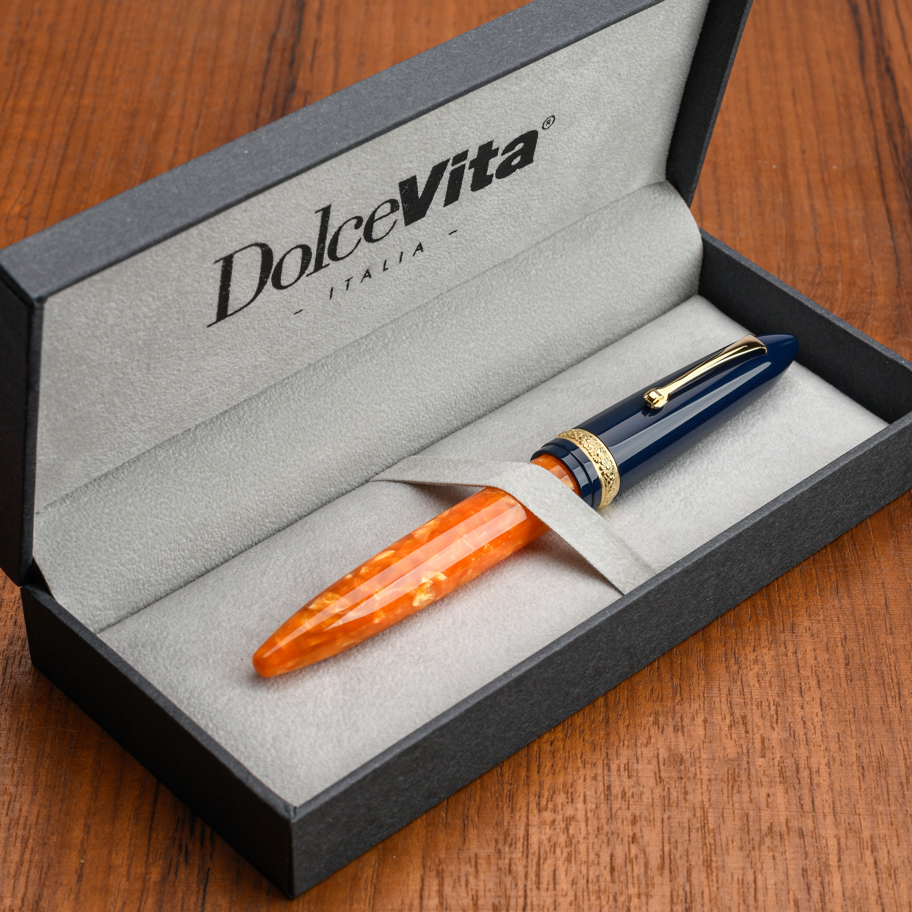 The fountain pen includes a screw-in converter, the case is personalized with the Dolcevita® logo.