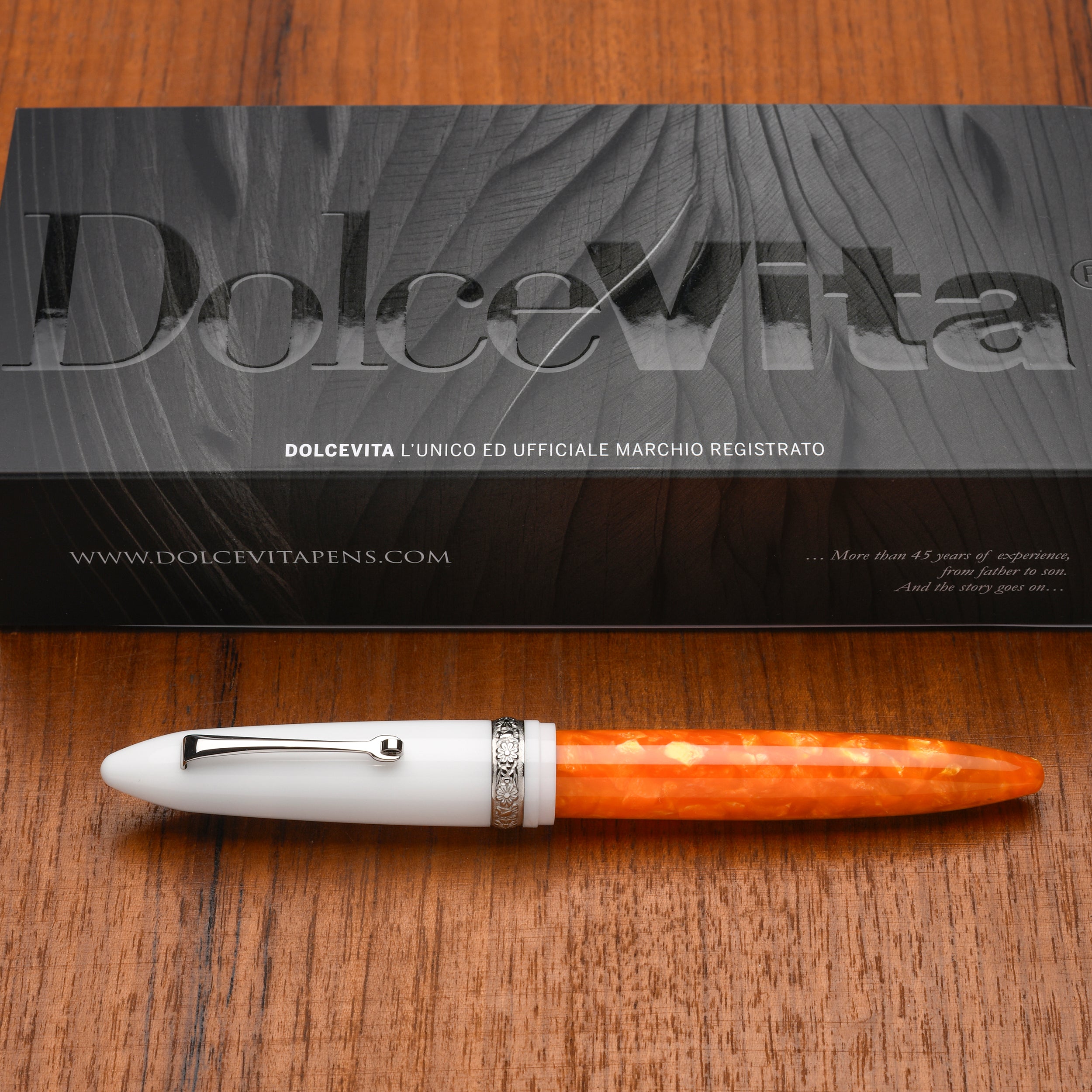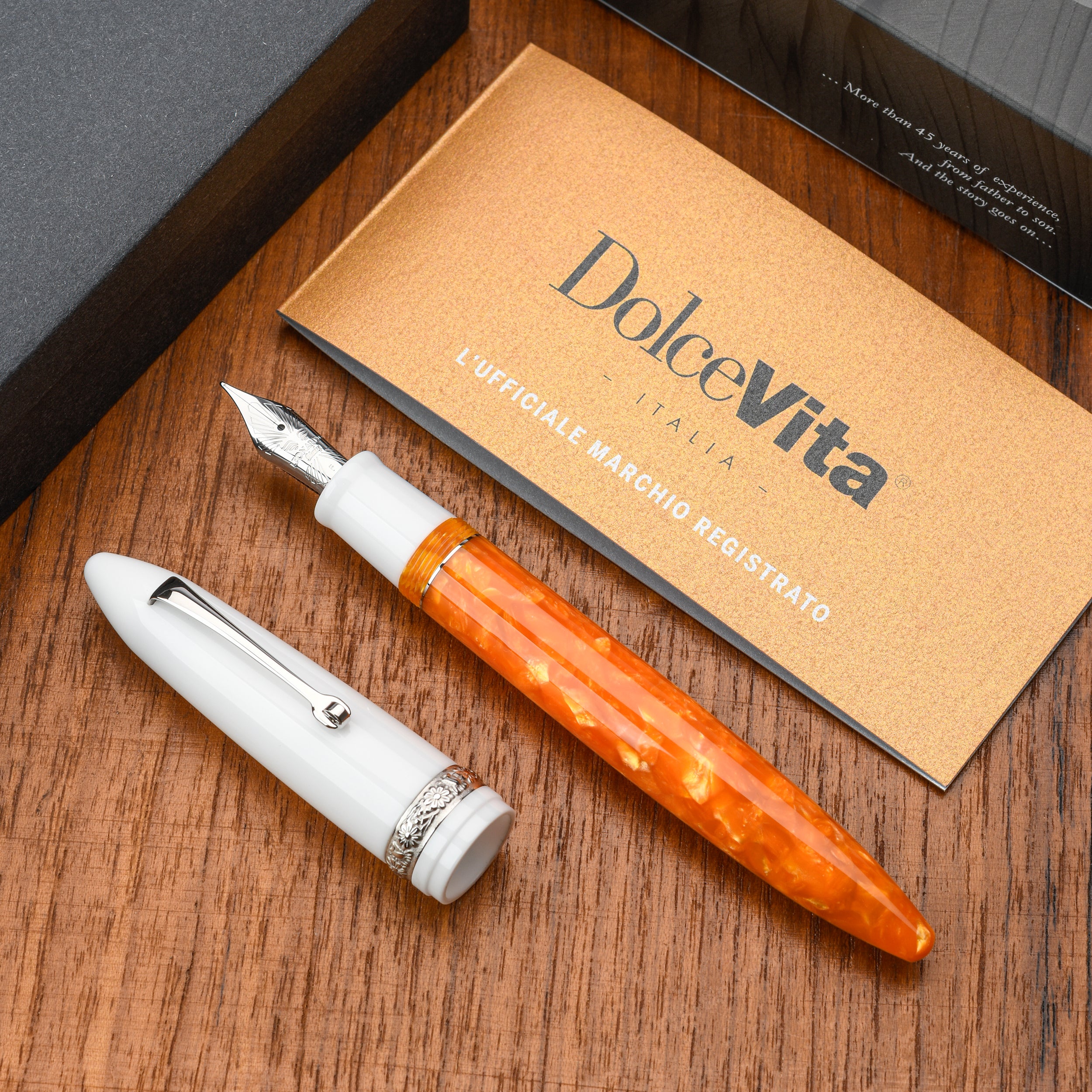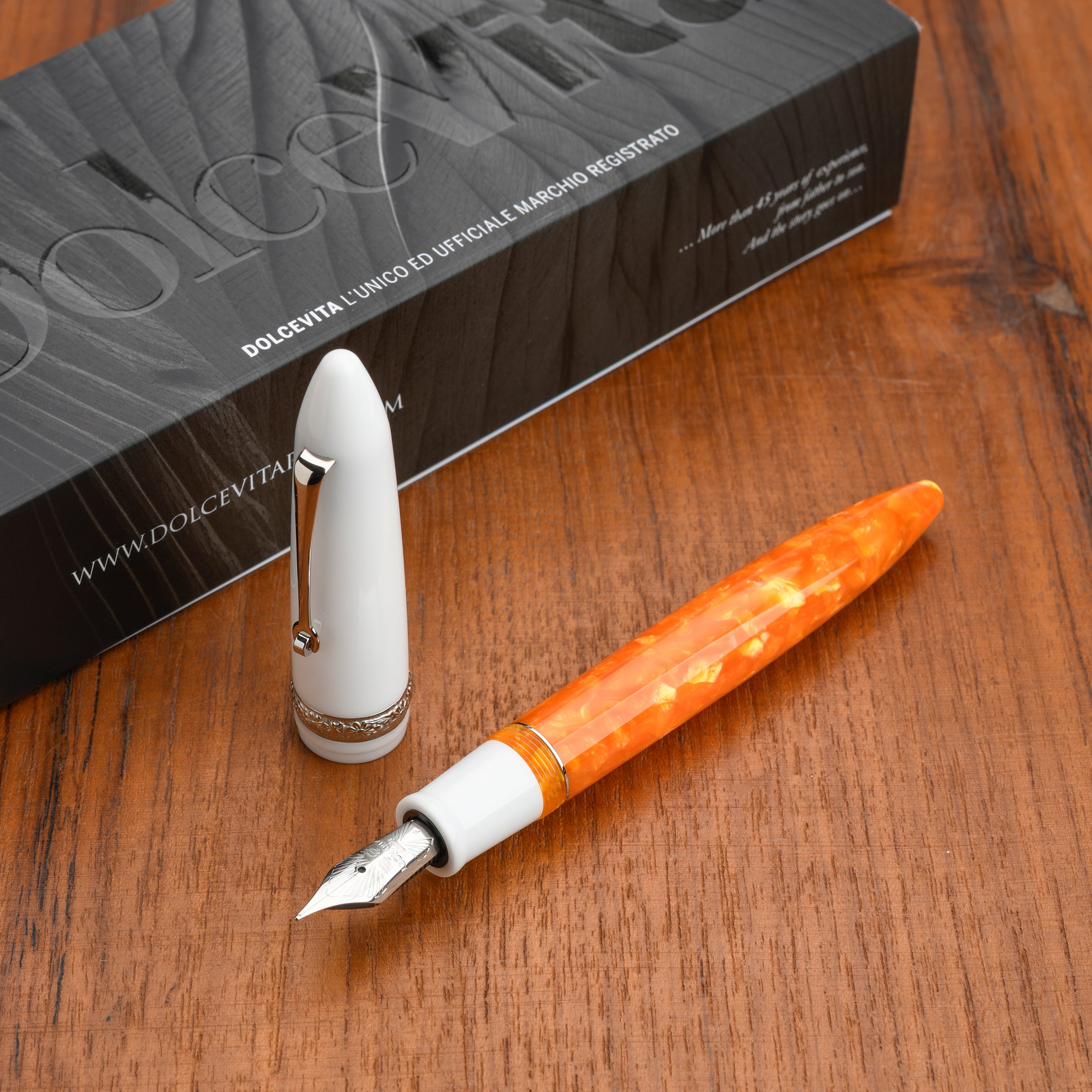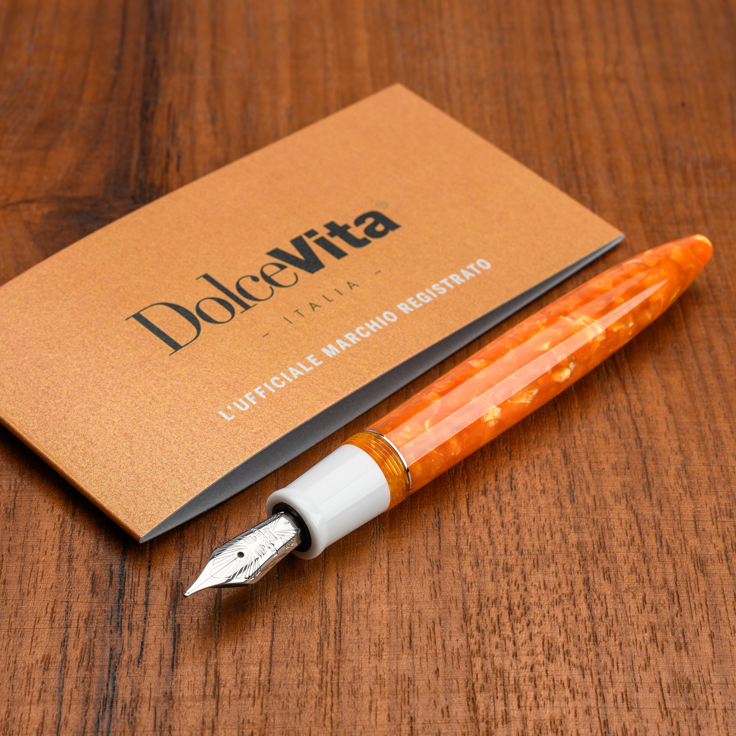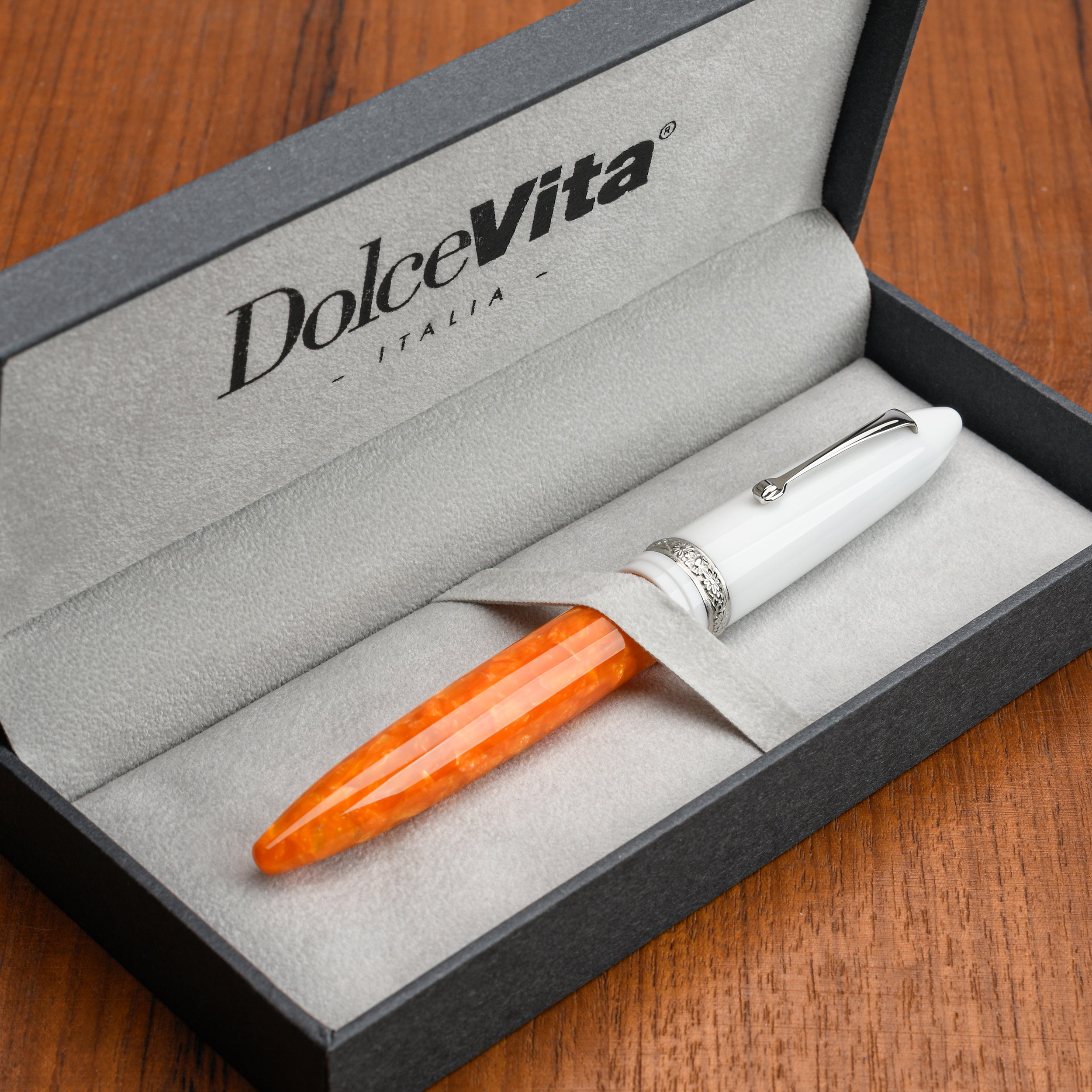 The fountain pen includes a screw-in converter, the case is personalized with the Dolcevita® logo.
